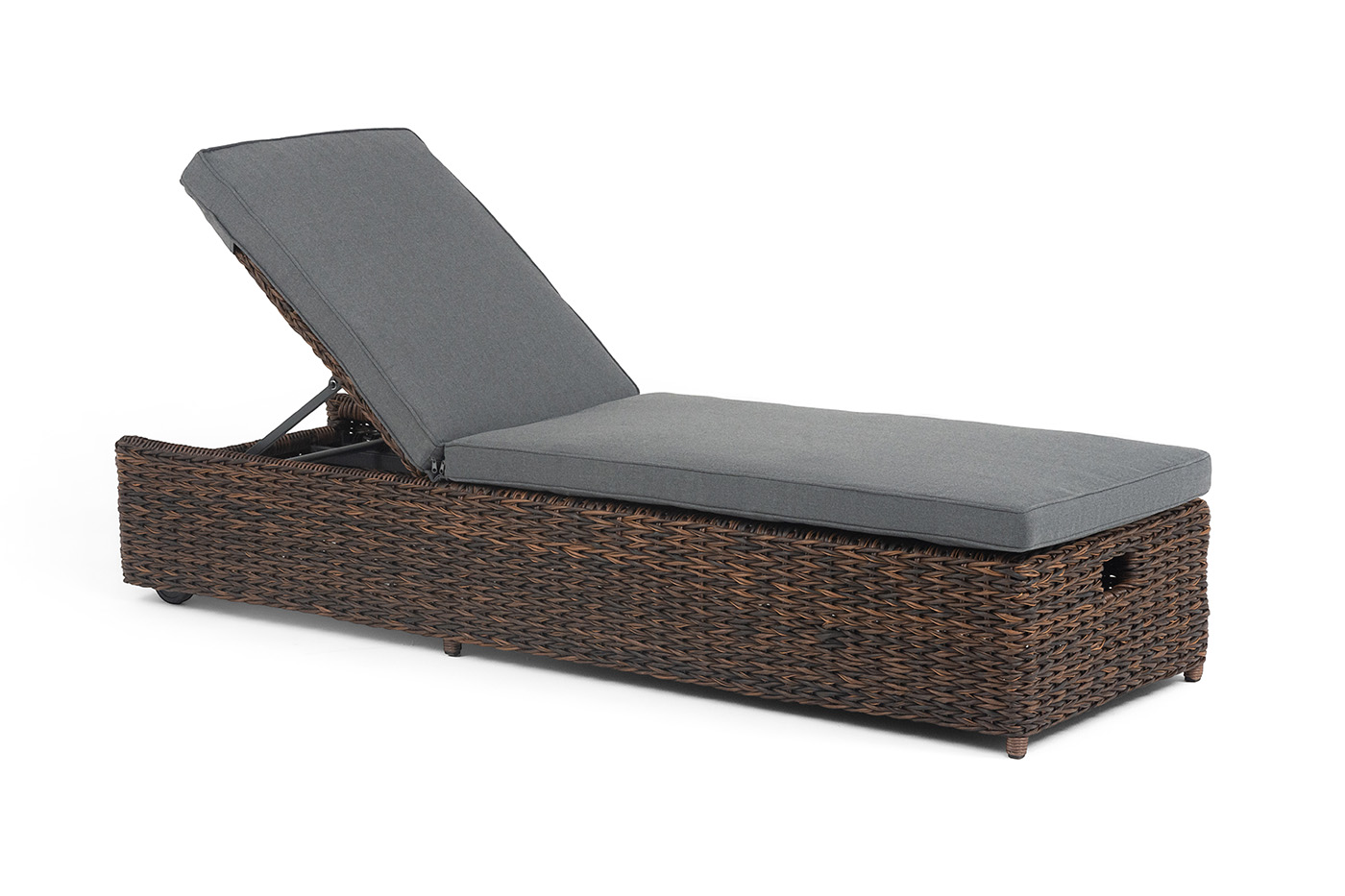 Есть несколько пазов, благодаря которым можно поднимать или опускать спинку. Также комфорт обеспечивает мягкий матрас. Съёмный чехол темно-серого цвета изготовлен из 100%-го полиэстера с водоотталкивающим эффектом. Мебель оплетена вручную.