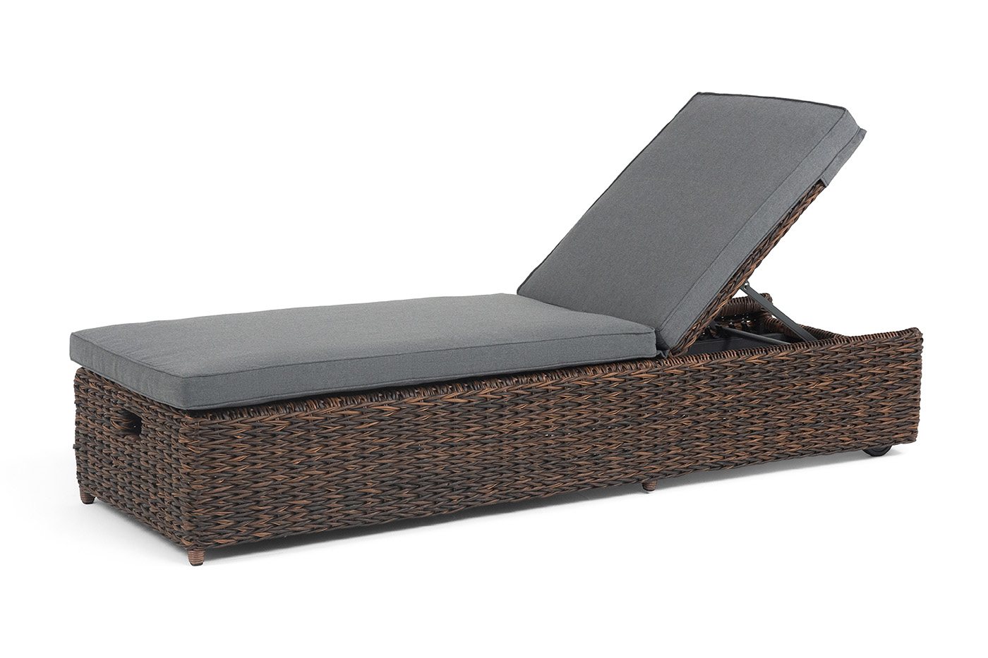Есть несколько пазов, благодаря которым можно поднимать или опускать спинку. Также комфорт обеспечивает мягкий матрас. Съёмный чехол темно-серого цвета изготовлен из 100%-го полиэстера с водоотталкивающим эффектом. Мебель оплетена вручную.