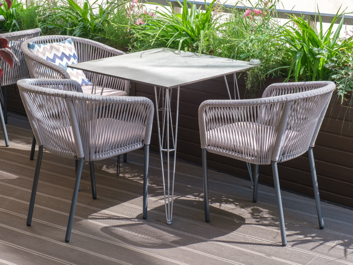 Основание изготовлено из металла, окрашенного в белый цвет. Столешница - из современного композитного пластика HPL неоднородного светло-серого оттенка, толщиной 12 мм. Это очень практичный, устойчивый к агрессивному воздействию извне материал: попаданию влаги, мытью химическими веществами. На это покрытие можно ставить горячие тарелки и чашки. Столик также можно использовать в открытых помещениях или на улице.