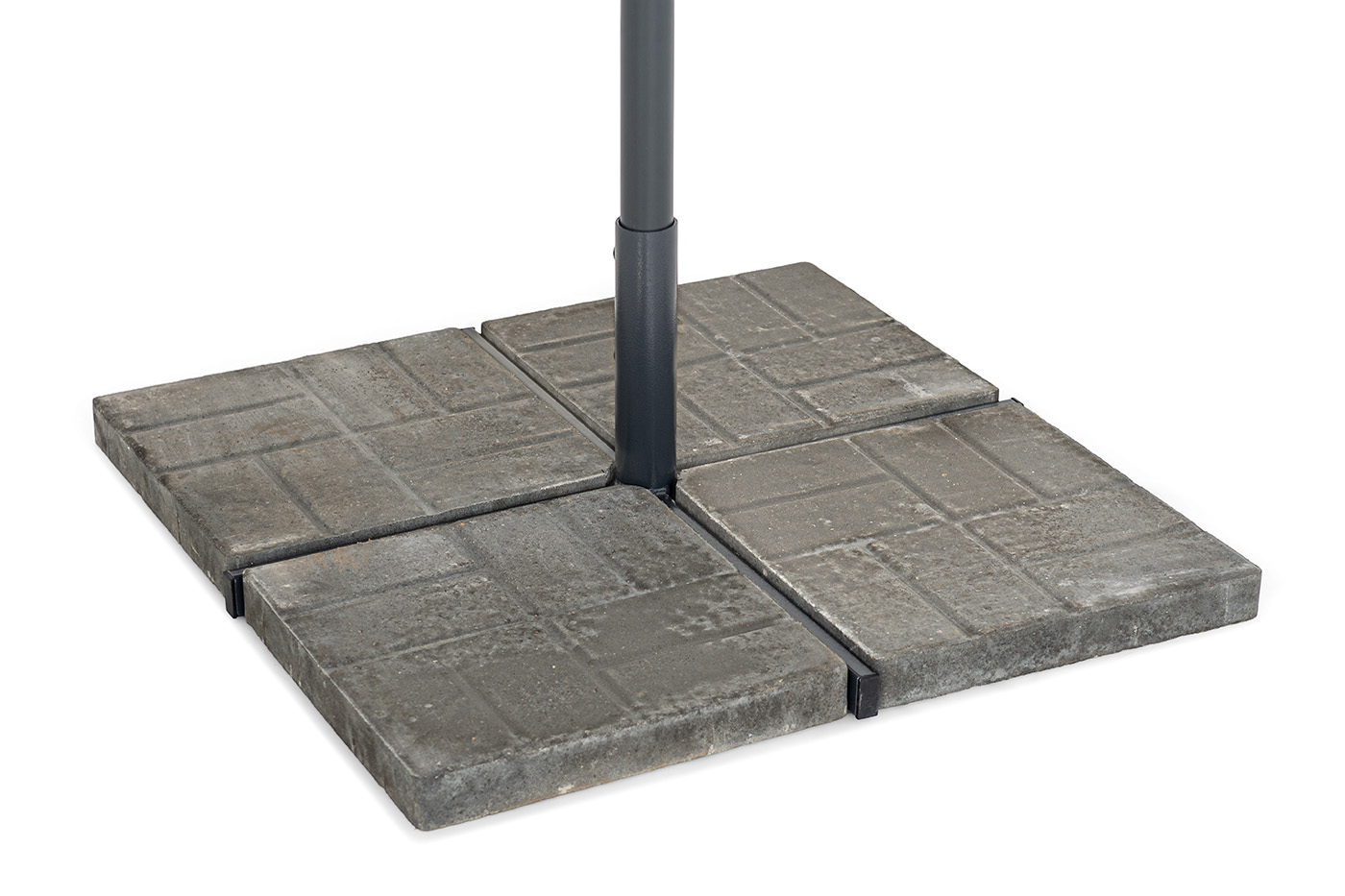 В комплект входят: крестовина, 4 утяжелительных плиты и трубка для зонта. Каждая плита весит не менее 16 кг, габариты — 810×810×50 мм. Общий вес базы с крестовиной составляет 71 кг.
